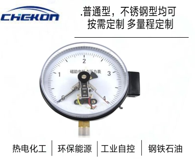 YXC系列磁助電接點壓力表廣泛應(yīng)用于石油、化工、冶金、電站等工業(yè)部門或機電設(shè)備配套中測量無爆炸危險的各種流體介質(zhì)的壓力。通常,以表經(jīng)與相應(yīng)的電氣器件(如繼電器及接觸器等)配套使用,即可對被測(控)壓力系統(tǒng)實現(xiàn)自動控制和發(fā)信(報警)的目的.
