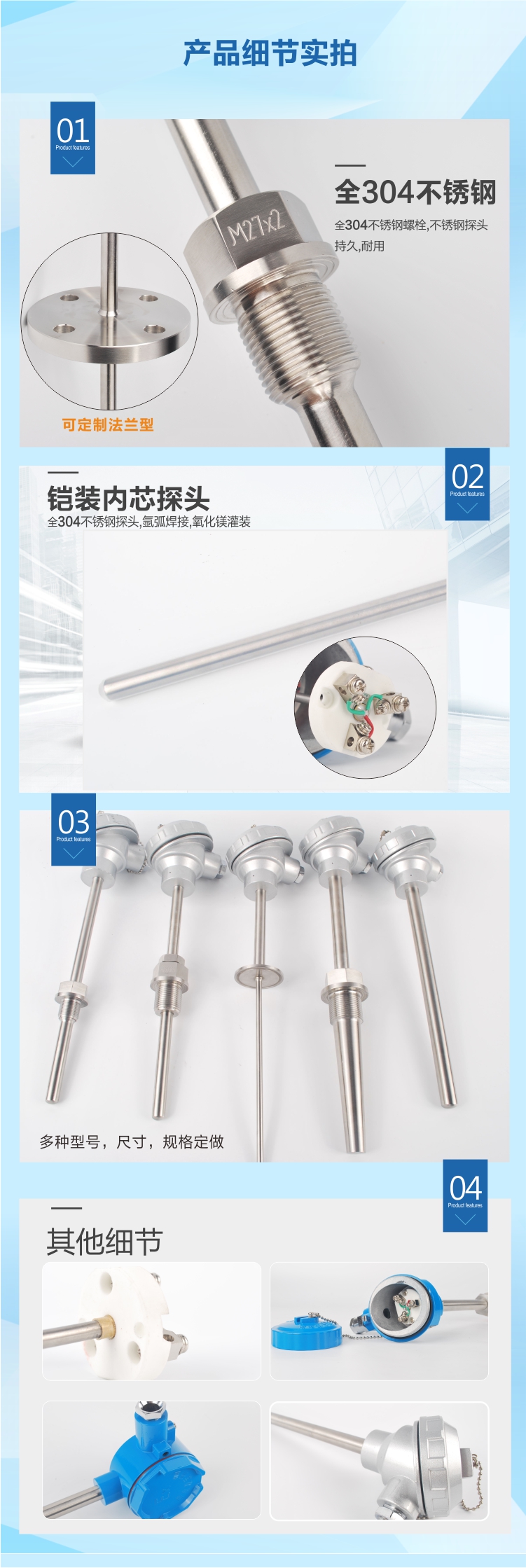 裝配式熱電阻是利用物質(zhì)在溫度變化時(shí),其電阻也隨著發(fā)生變化的特征來測量溫度的。當(dāng)阻值變化時(shí),工作儀表便顯示出阻值所對(duì)應(yīng)的溫度值。